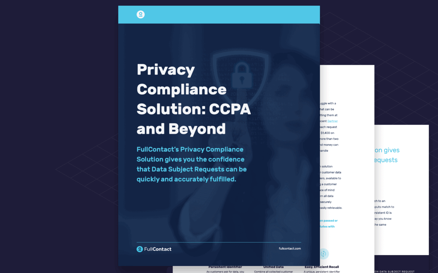 FullContact’s privacy compliance solution enables you to consolidate your customer data assets under persistent identifiers, available to you in real time. When receiving a customer data request, you can have peace of mind knowing that you’ll quickly return all data collected on them because it’s securely connected, consolidated, and easily retrievable.