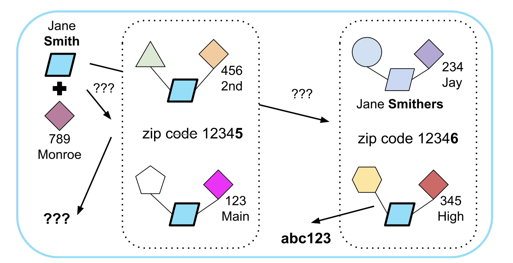 Figure 4. A query for Jane Smith at 789 Monroe in zip code 12345 can’t return an unambiguous result because 1) we don’t have an exact match for that name and address, and 2) the name isn’t unique in zip code 12345. On the other hand, we can return an inferred ID for zip code 12346 (where we don’t have an exact address match, but we DO know that only one identity within zip code 12346 has the name Jane Smith).