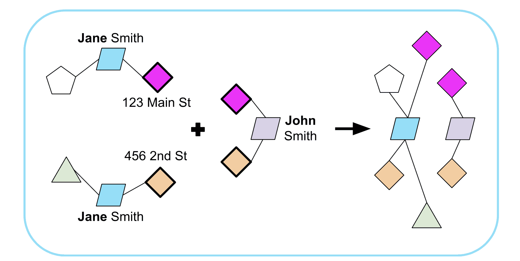 In the case of the graph build, we might have two disjoint collections of contact information for Jane Smith at different addresses without enough unique shared data between them to justify their connection. But if Jane Smith fragment #1 is connected through residence at 123 Main Street to John Smith at 123 Main Street, and if Jane Smith fragment #2 is connected to 456 Second Street in the same city with the same John Smith, we can reasonably assume that Jane Smith #1 and #2 are the same person and connect those fragments.