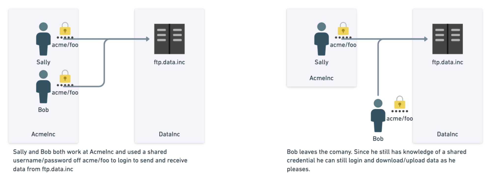 - Let’s further imagine that foo is Sally’s favorite password that she uses everywhere else. Using a brute force dictionary attack or data breach containing common passwords for Sally, it is not hard for Evil Bill (who has nothing to do with AcmeInc) to log into their FTP account hosted at DataInc. Evil Bill can then start reading all their data.