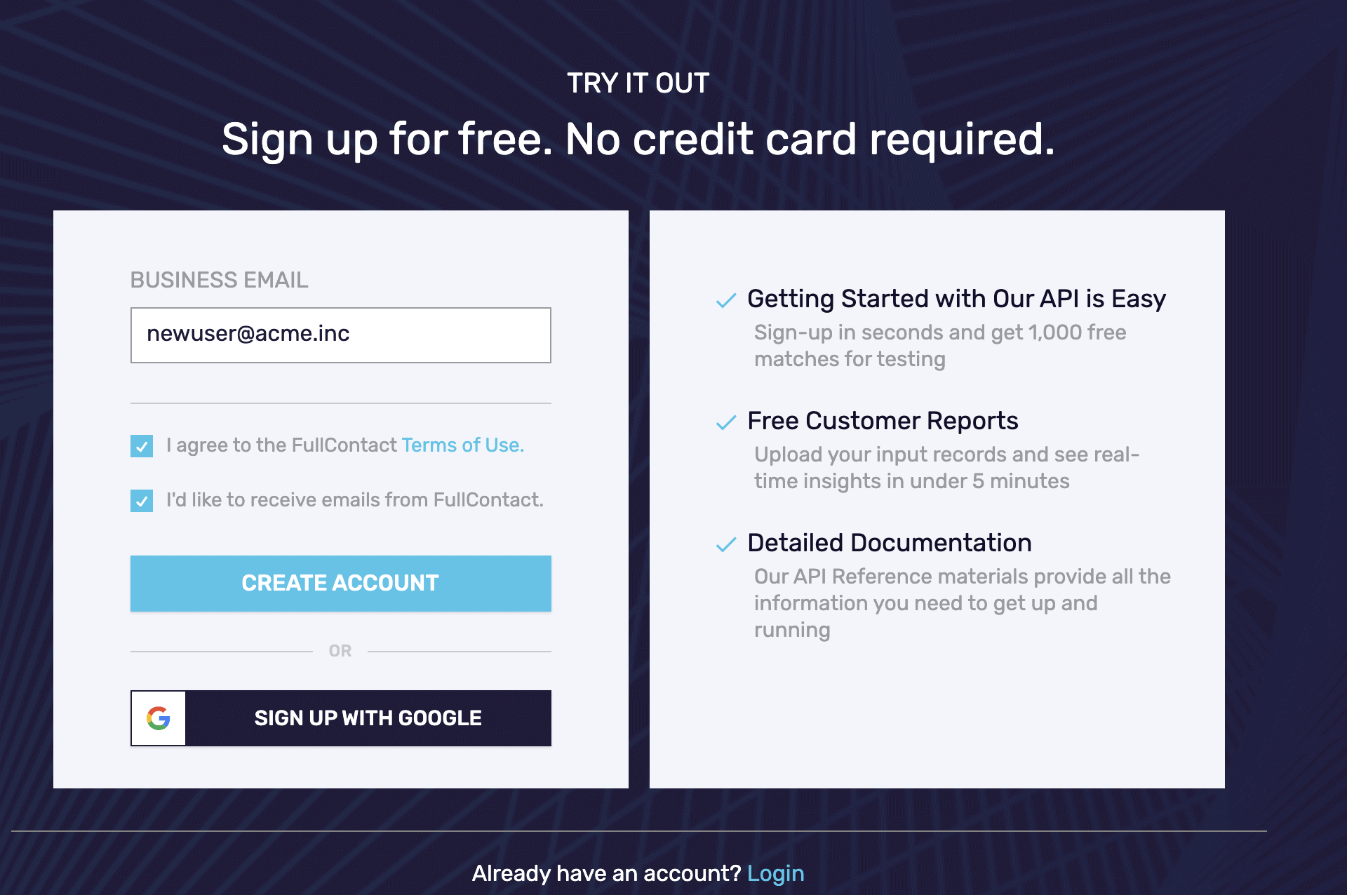 - Create or log in to your FullContact Dashboard account.