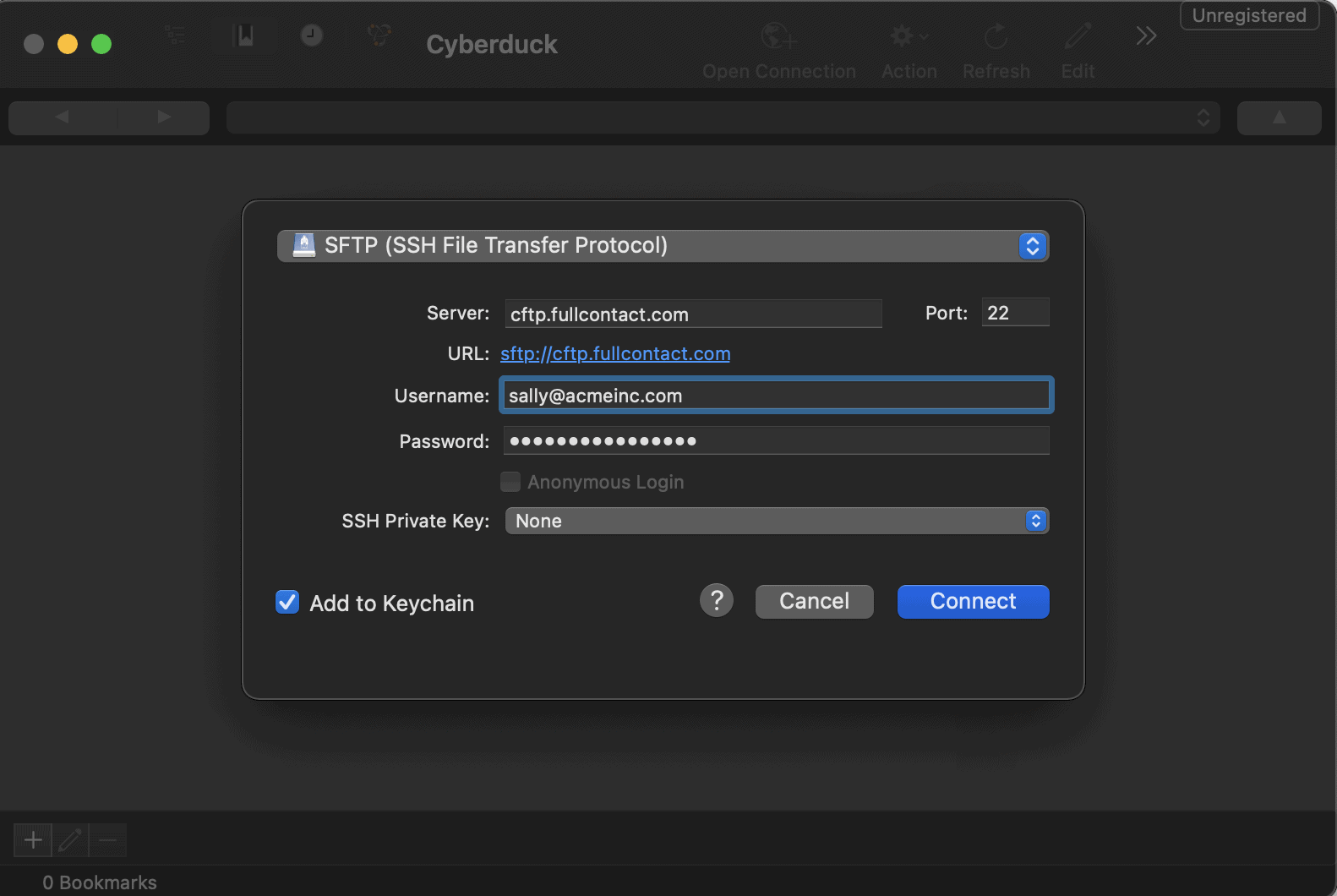- Server: cftp.fullcontact.com (notice it is a ‘c’, not an ‘s’); and if asked for, use port 22