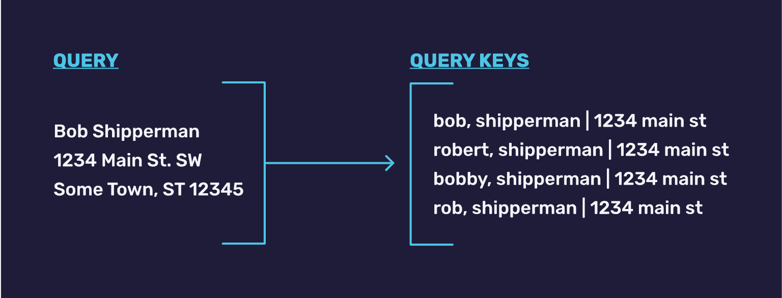 This new name/address key was then folded into our existing exact-match approach. This new key only worked up to a point though, because we then needed to account for variations on first names, including things like nicknames or formal names. To handle this issue, we expanded incoming queries for name and address to the corresponding nicknames and formal names which would allow us the best chance for matching.