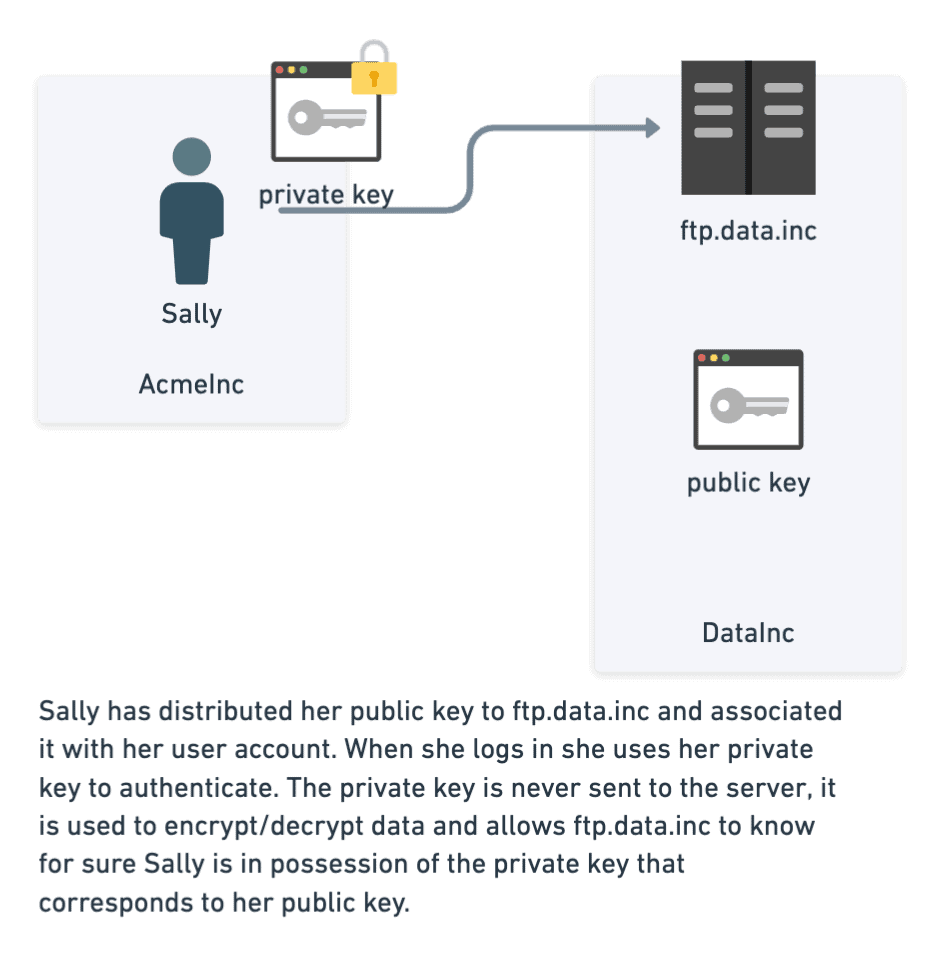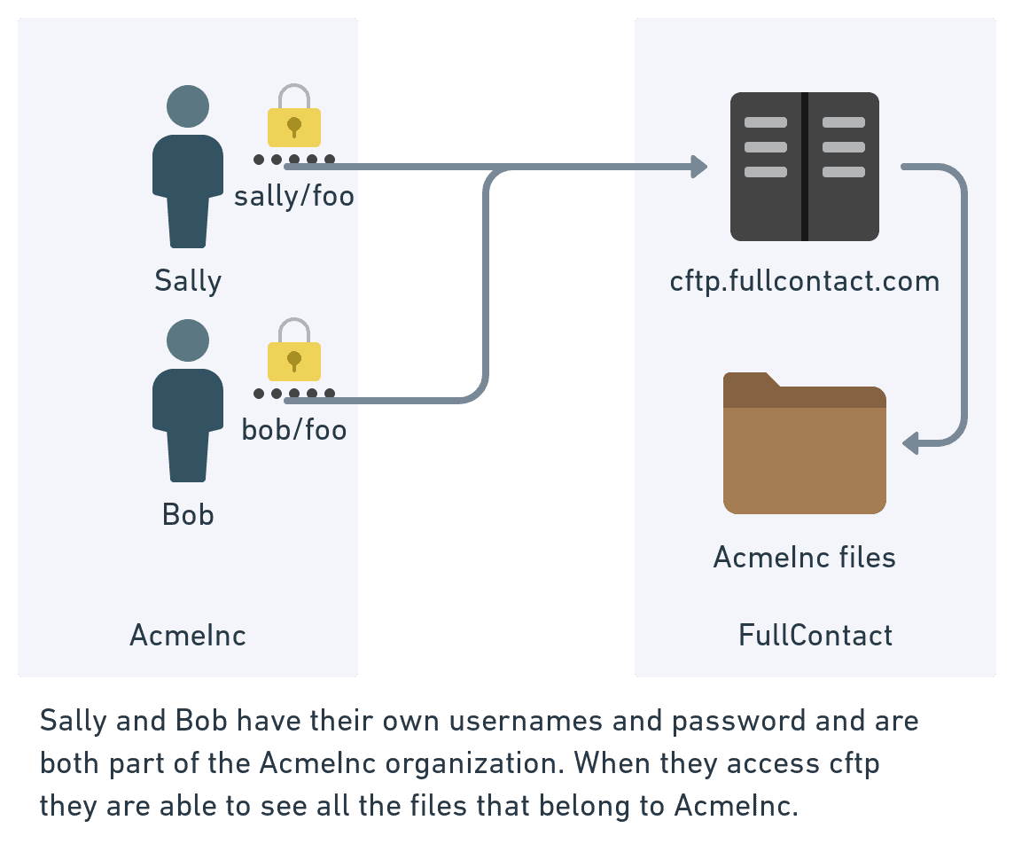 - Bob and Sally work at AcmeInc, and both need to send data to a company called DataInc. DataInc proceeds to create a username called acme with password foo.
