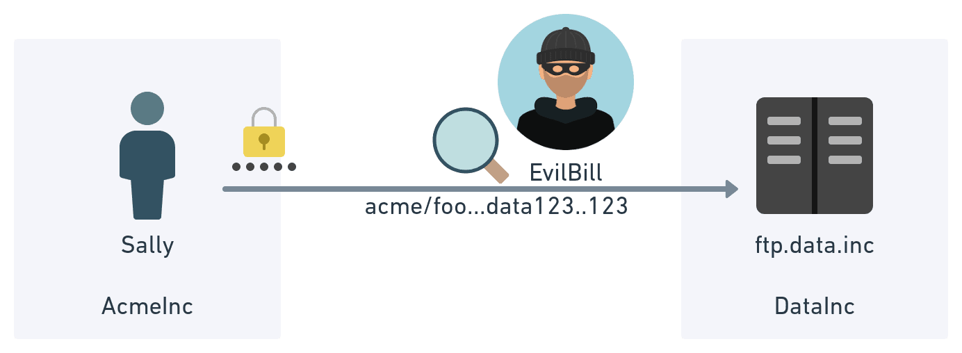 Whenever you are connecting to a server on the public internet, whether that is a web server or a FTP server, there is the chance you might not be connecting to who you think you are connecting to. Imagine the scenario below where Sally thinks she is connecting to ftp.data.inc. In reality, Evil Bill has set up a new server that intercepts the original commands, logs them, and forwards them to the real ftp.data.inc. At this point, Evil Bill has all of the data and any user data and passwords sent.