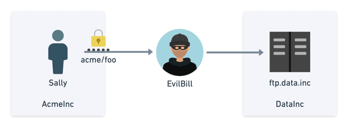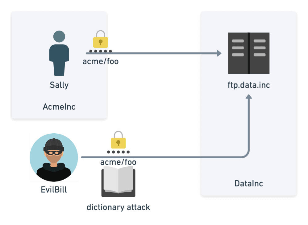 - Let’s further imagine that foo is Sally’s favorite password that she uses everywhere else. Using a brute force dictionary attack or data breach containing common passwords for Sally, it is not hard for Evil Bill (who has nothing to do with AcmeInc) to log into their FTP account hosted at DataInc. Evil Bill can then start reading all their data.