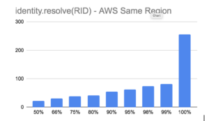 Once we had the Resolve API assembled, we wanted to ensure we hit the targets we set out to achieve – benchmarking your API is the simplest way to understand these characteristics. Below summarizes a few results from Apache Benchmark on our Resolve API using pre-mapped RIDs as input to the identity.resolve endpoint. A key characteristic of each test is that it uses ‘connection reuse’ to avoid the costly SSL setup time.
