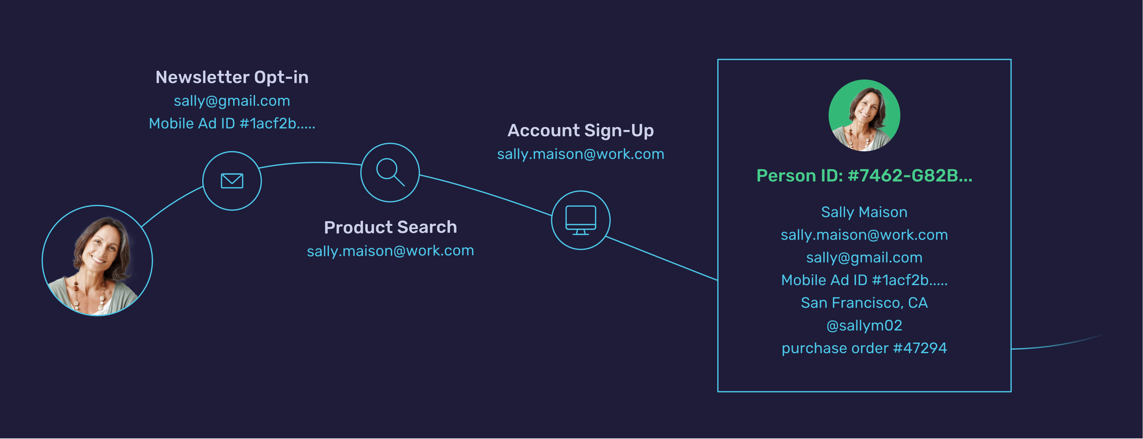 Let’s dive into an example–say Sally visits your customer’s website and signs up for their newsletter on her phone. While at work, she sees something in the newsletter that catches her eye and she wants to know more about it. Maybe she decides to search on her work computer instead of clicking through the newsletter on her phone. When purchasing, Sally ends up signing up for an account on her work computer, with a different email address than the one she had previously used to sign up for the newsletter. Having a single persistent ID for Sally, means that she doesn’t become two individuals within your reporting. You know that Sally who signed up for the newsletter using sally@gmail.com is the same Sally who signed up for an account using sally.maison@work.com. And with that knowledge, you can pull all of her interactions with your customer into one clean profile so that your customer knows what truly converts and what Sally’s full journey looked like.